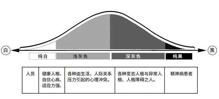 如果將人的心理正常比作白色,心理不正常比作黑色,那么在白色與黑色之間存在著一個巨大的緩沖區(qū)域--灰色區(qū)域。我們絕大部分人的心理健康狀況都處在中間的灰色區(qū)域,也就是說絕大部分人都有這樣或那樣的心理健康問題,如果盡早進(jìn)行心理干預(yù),很大程度上可以避免精神疾病的發(fā)生。